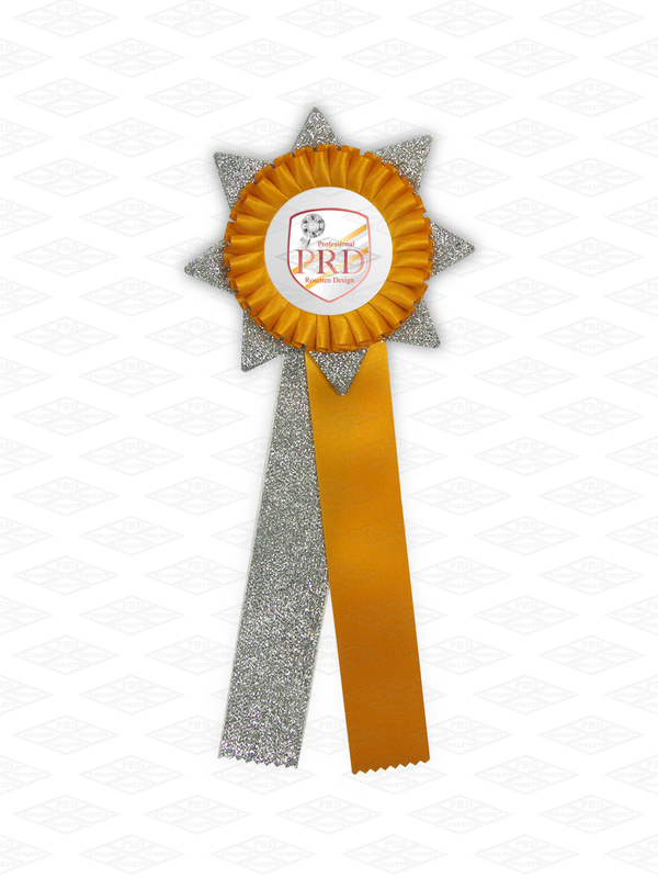 Beneath a tightly ruched premium rosette, eight points are assembled into a star made of gold-metallic material